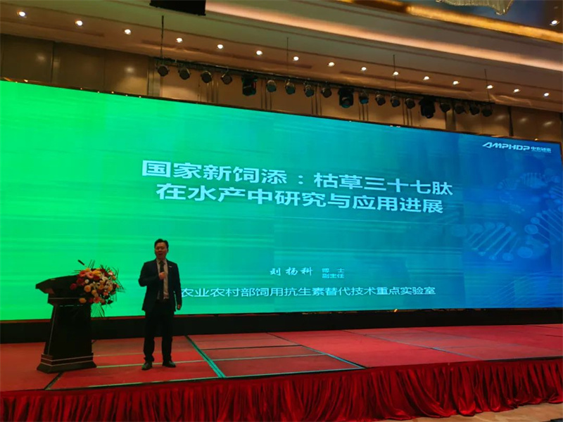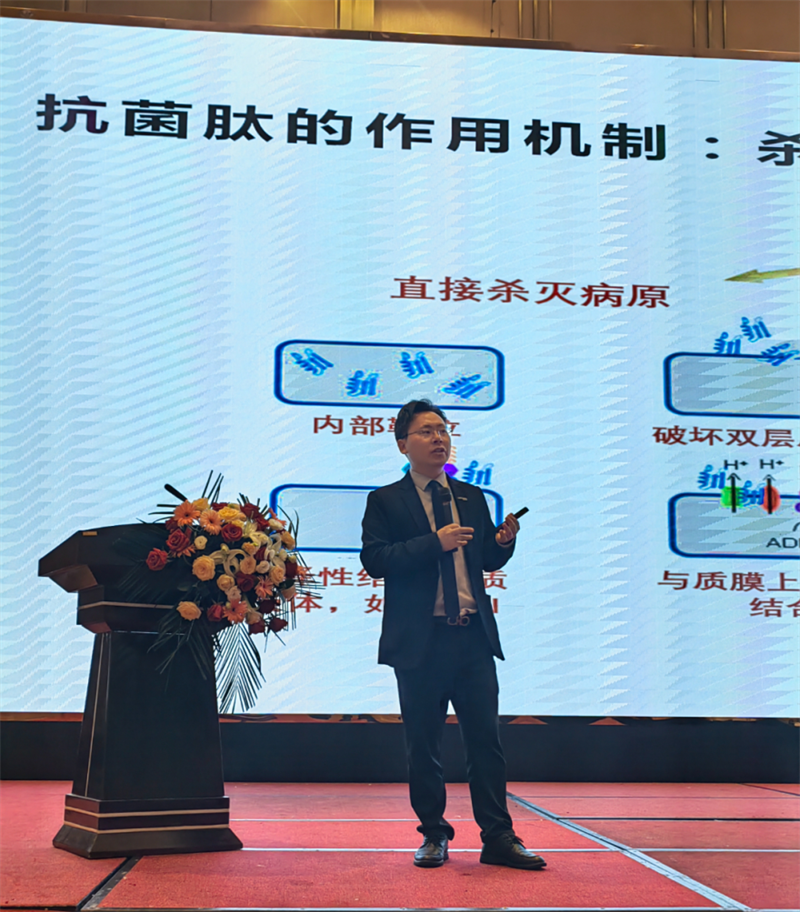 中農(nóng)穎泰集團(tuán)副總經(jīng)理劉揚(yáng)科博士出席會(huì)議,并做題為國(guó)家新飼添-枯草三十七肽的精彩報(bào)告,劉博士首先介紹了枯草三十七肽的研究歷程,及國(guó)家新飼添的申報(bào)歷程,集團(tuán)數(shù)十年專注于抗菌肽的艱苦研發(fā),終于獲得國(guó)家首個(gè)抗菌肽新飼添證書(shū),開(kāi)創(chuàng)了抗菌肽應(yīng)用研發(fā)新紀(jì)元!劉博士詳細(xì)闡述了抗菌肽的作用機(jī)制、現(xiàn)場(chǎng)應(yīng)用效果。在水產(chǎn)上,抗菌肽具有促進(jìn)生長(zhǎng)、修復(fù)腸道、提高免疫力增加成活率等作用,中農(nóng)穎泰抗菌肽水產(chǎn)飼料產(chǎn)品成分明確、安全合法可檢測(cè)、效果顯著廣泛使用。