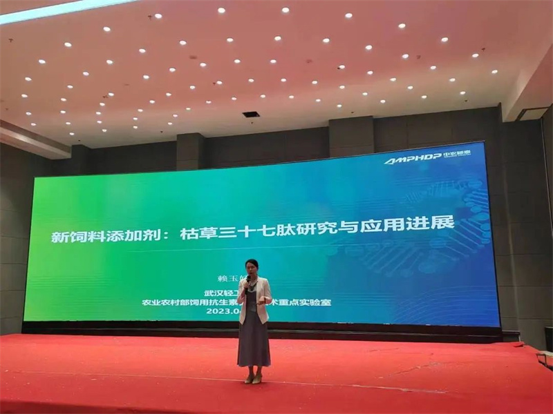4月21日上午,武漢輕工大學(xué)賴玉嬌博士做《新飼料添加劑:枯草三十七肽研究與應(yīng)用發(fā)展》主題分享報(bào)告。賴博士從“飼用替抗”產(chǎn)品的市場(chǎng)需求出發(fā),談到了在眾多的替抗方案中,抗菌肽因其獨(dú)特的作用機(jī)制(破壞病原體膜結(jié)構(gòu)的完整性)、不易產(chǎn)生耐藥性、綠色安全,被認(rèn)為是抗生素的首選替抗品。2022年11月,中農(nóng)穎泰自主研發(fā)的枯草三十七肽榮獲抗菌肽新飼添證書(shū)(證書(shū)號(hào):新飼證字(2022)04號(hào))。