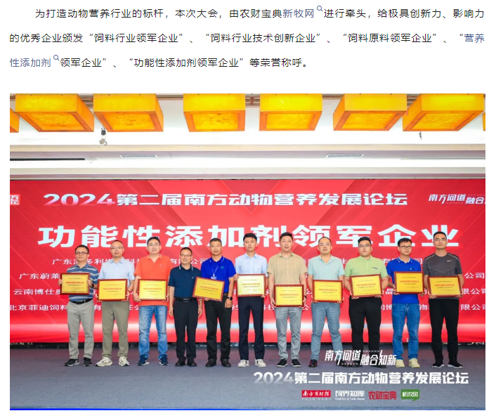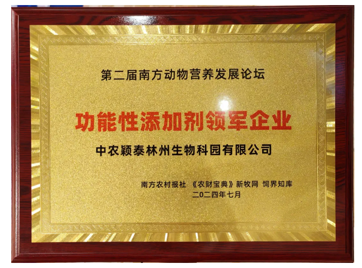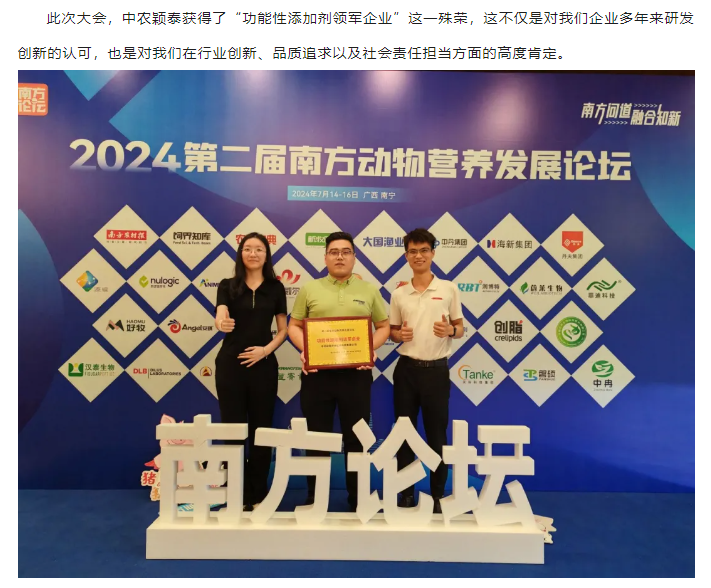 中農(nóng)穎泰獲評2024第二屆南方動(dòng)物營養(yǎng)發(fā)展論壇“功能性添加劑領(lǐng)軍企業(yè)"