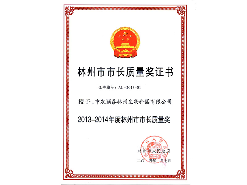 林州市市長質(zhì)量獎(jiǎng)證書